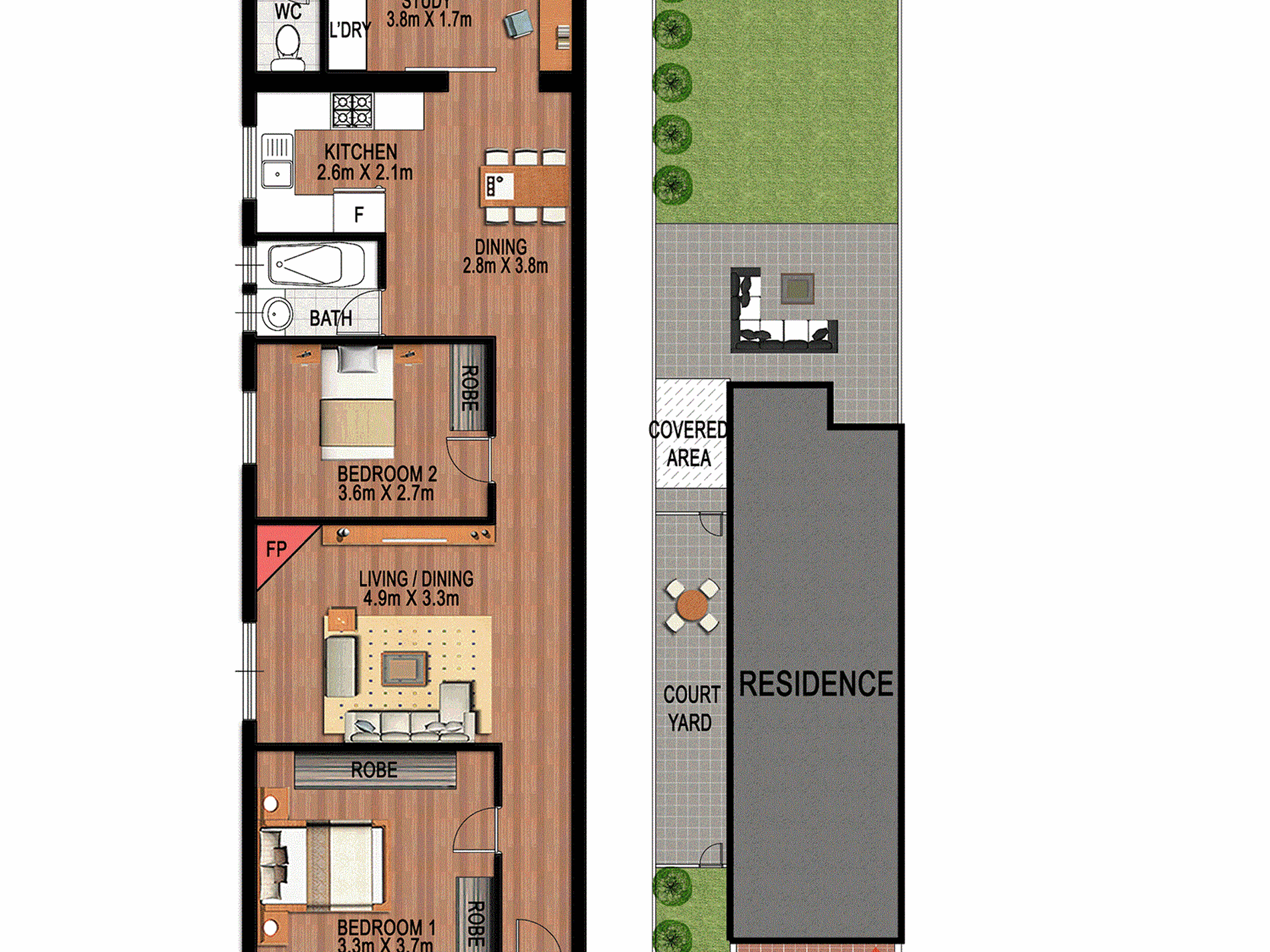- Sunlit rear courtyard and outdoor entertainment area