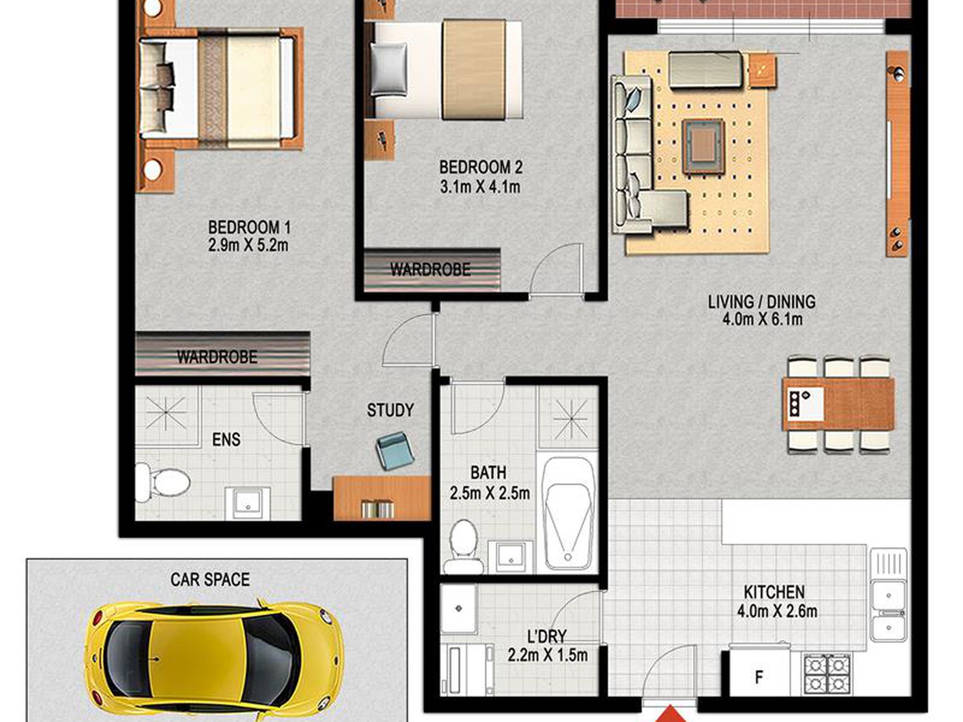 - Two generous bedrooms both with builtin robes plus a STUDY