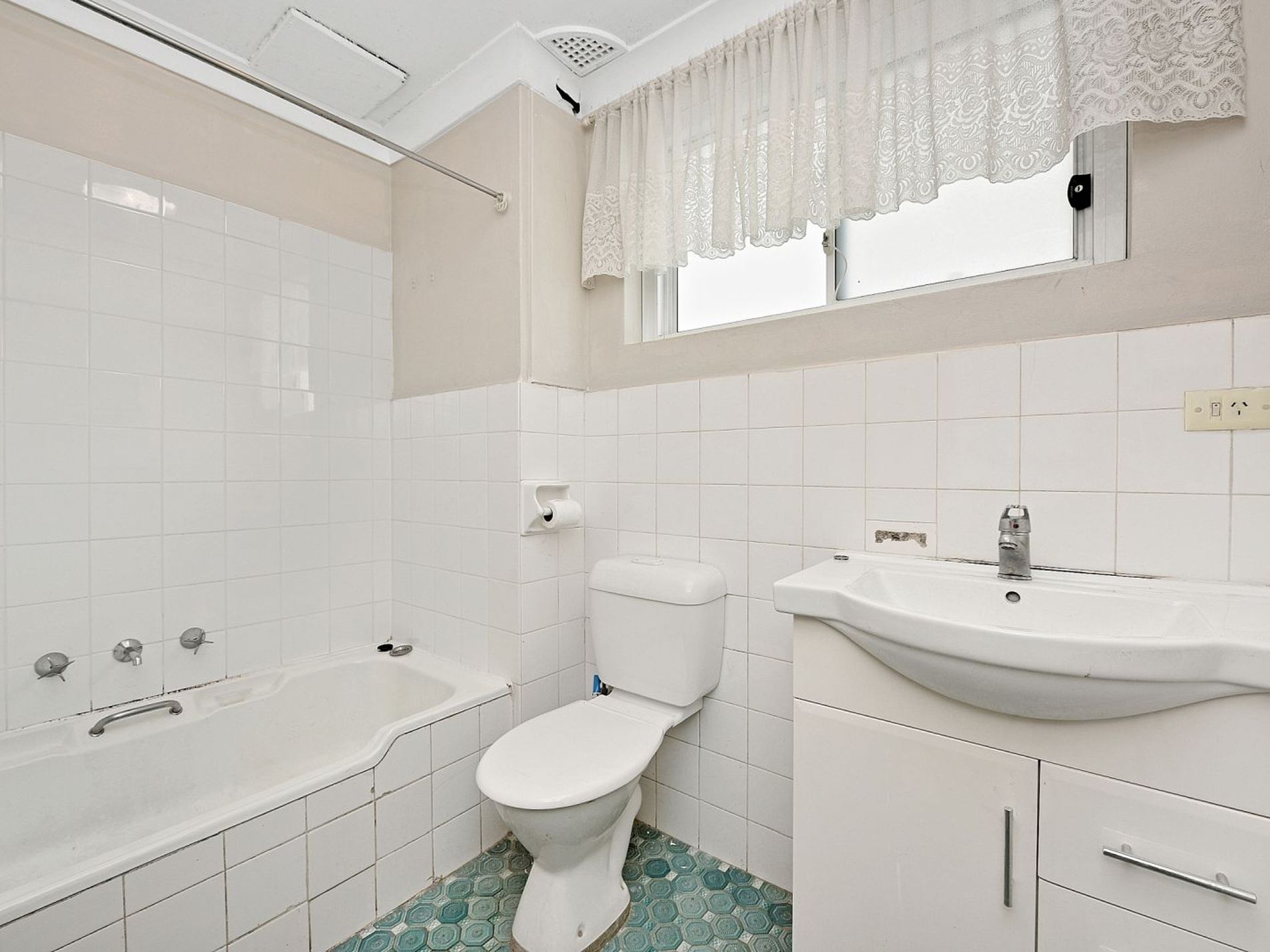 Tiled bathroom with combined bath and shower