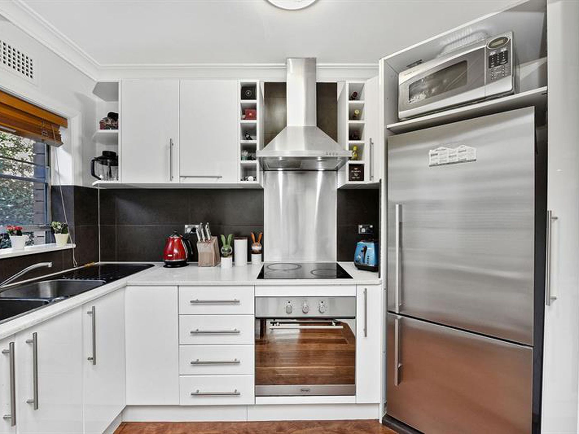 Modern kitchen with stainless steel appliances and stone benchtop