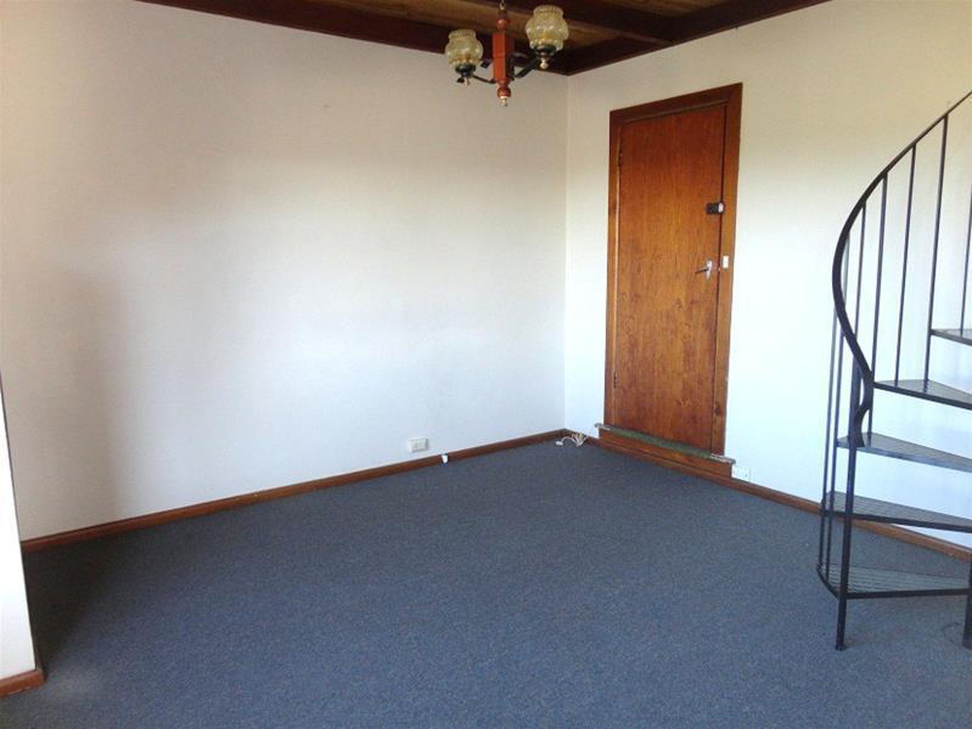 * Lounge room with spiral staircase to bedroom