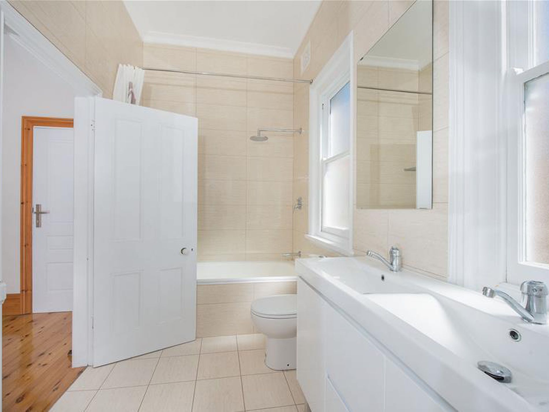* Spacious bathroom with double basin and high ceilings