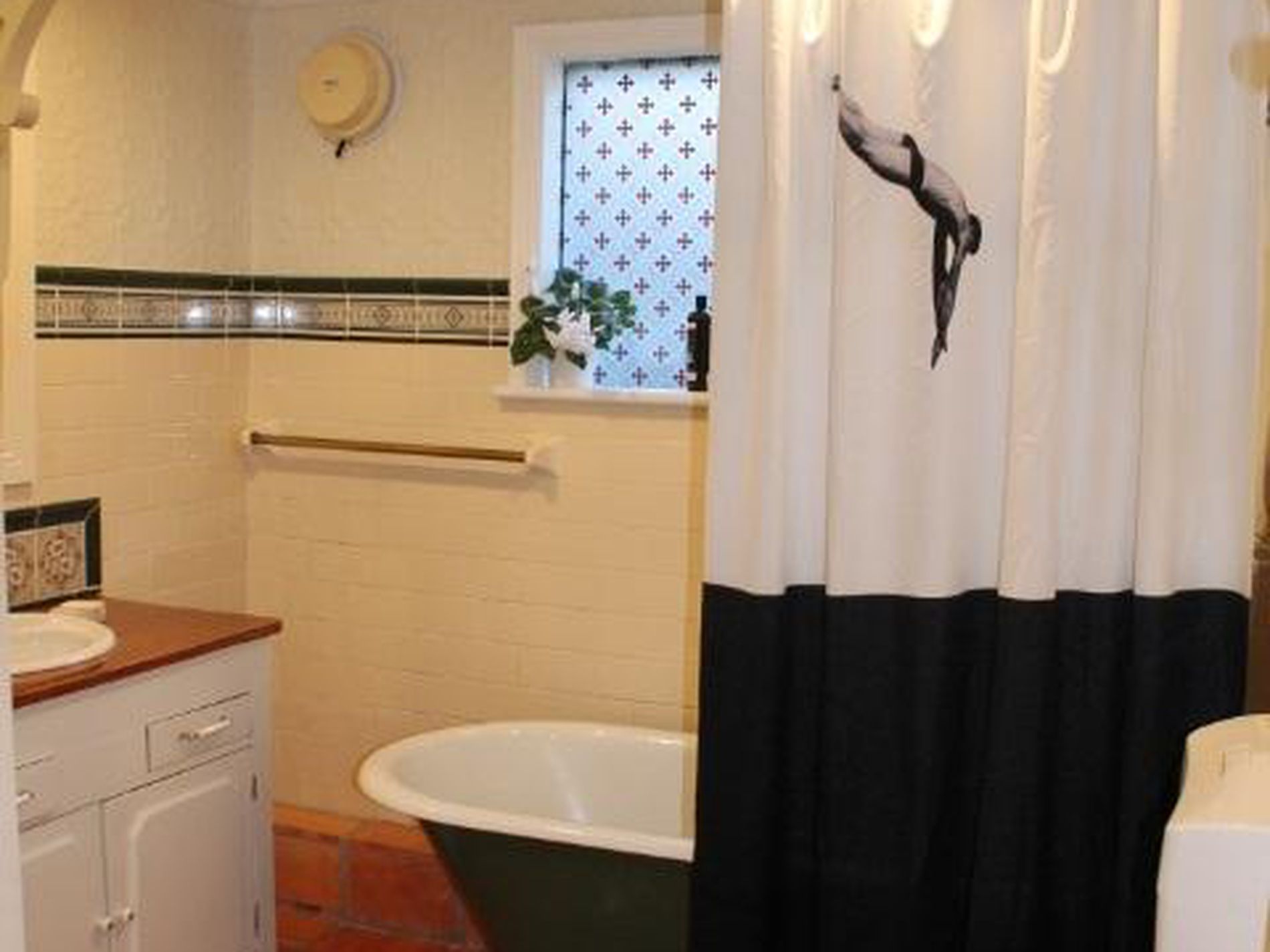 * Large bathroom with bath/ shower and storage for linens.