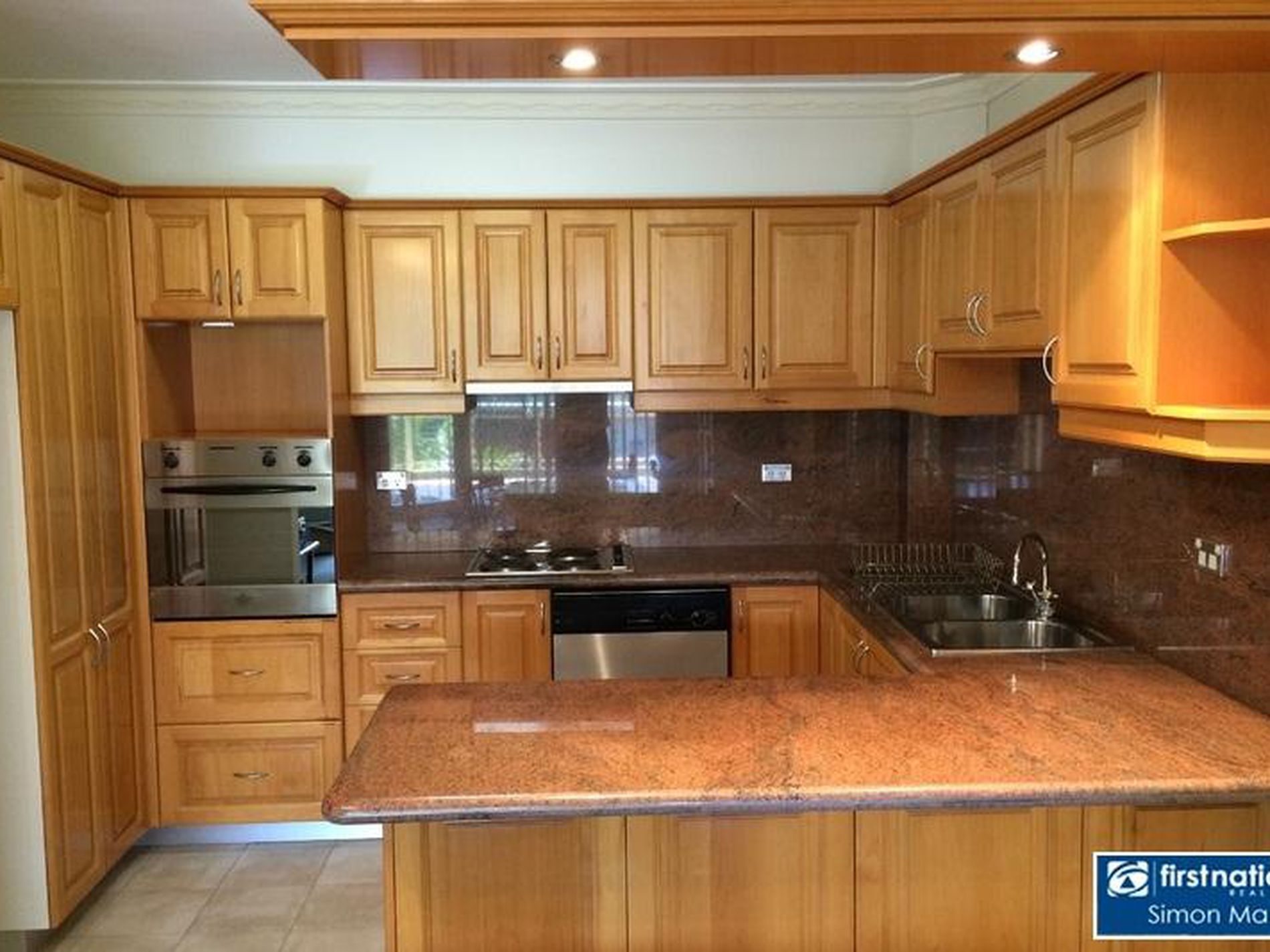 * Open plan granite timber kitchen with stainless appliances.