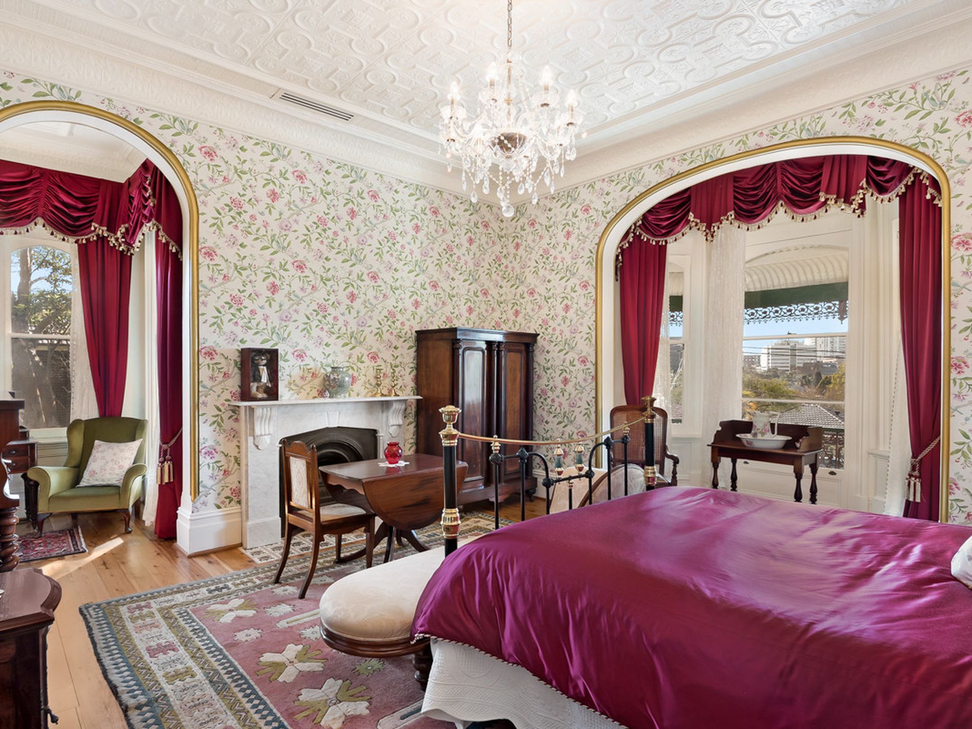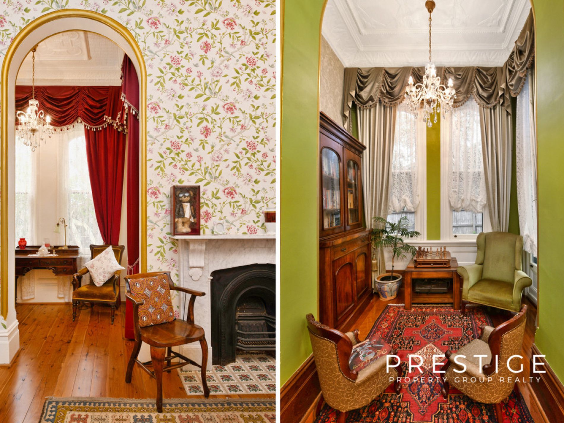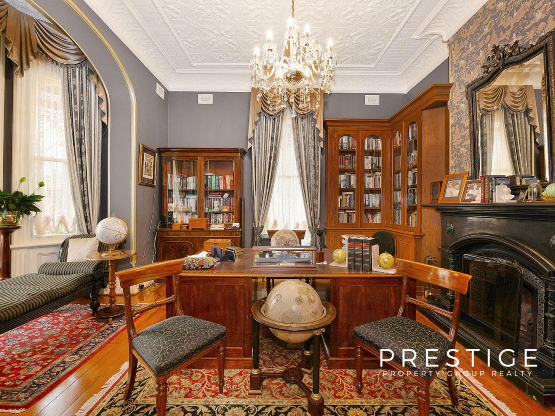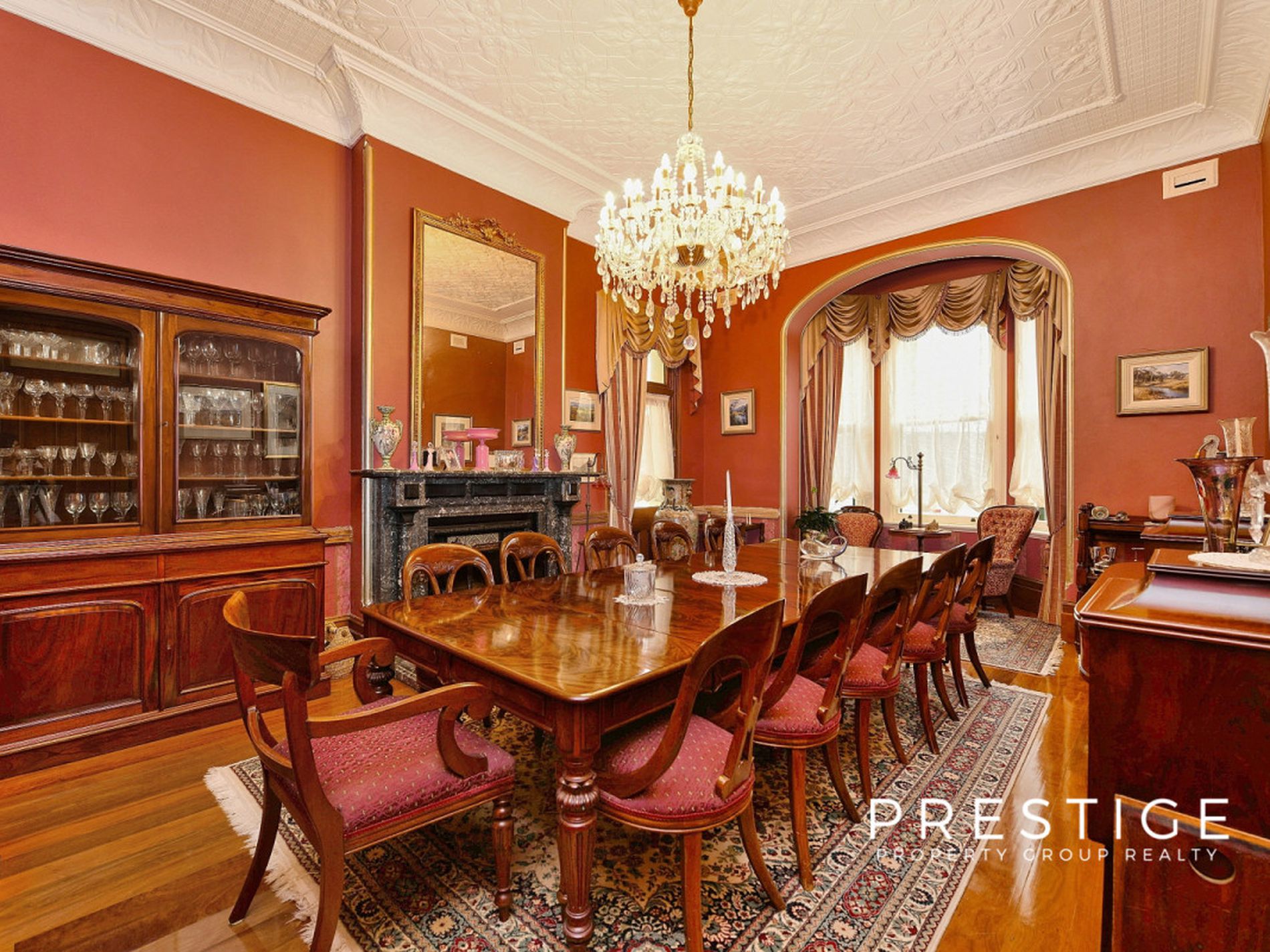 - Grand formal living areas, formal dining room, soaring ceilings (3.5m), with decorative pressed metal, 7 magnificent marble fireplaces, in working order; and stunning Australian Red Cedar joinery, library with built in bookcases, fully reverse cycle air conditioned throughout. Stunning wallpapers, drapes & blinds & dcor, polished original and new floorboards, all work carried out by quality tradesmen.