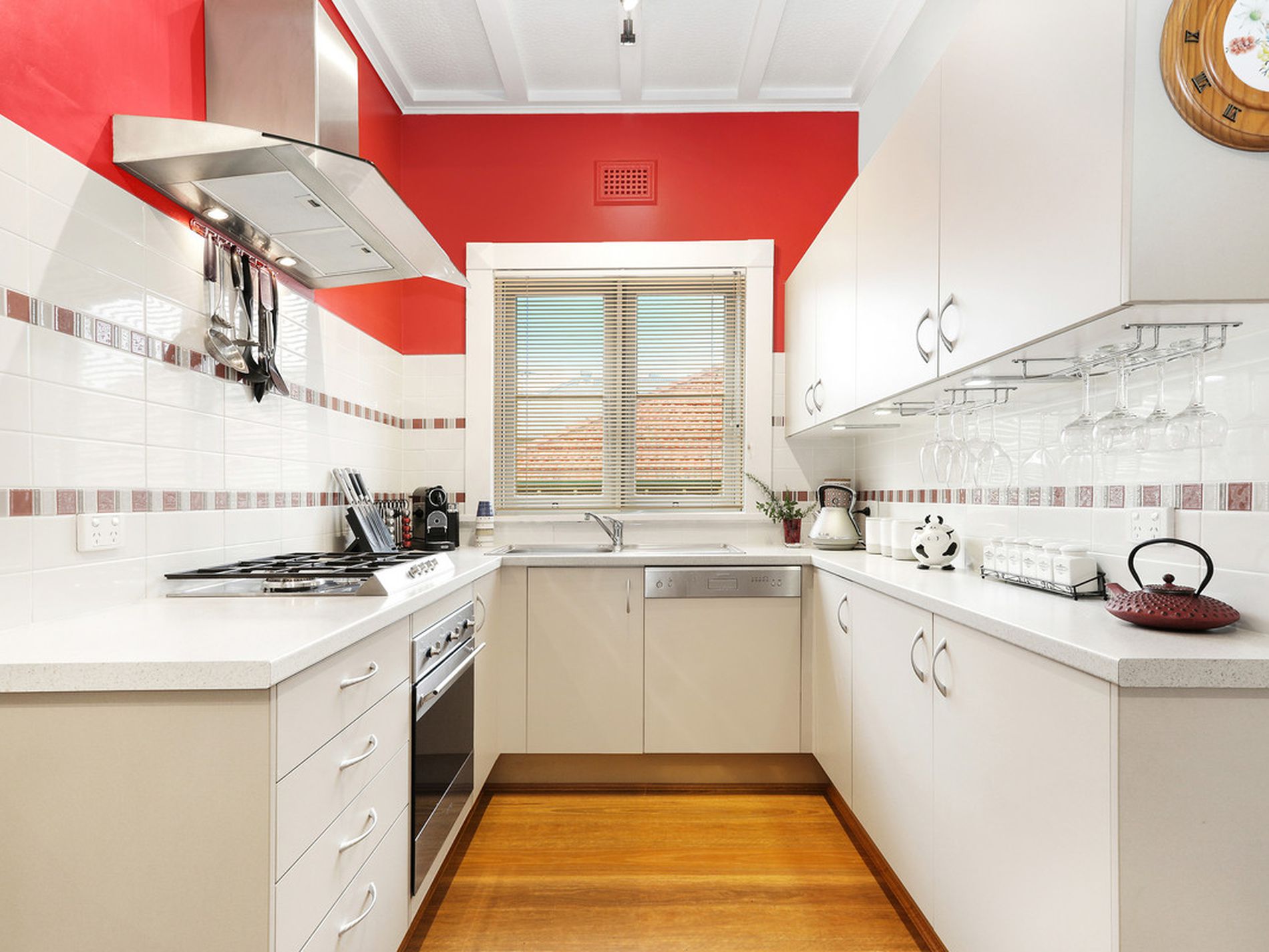 Galley style kitchen with breakfast bar, gas-cooking, laminate benchtops with SMEG appliances