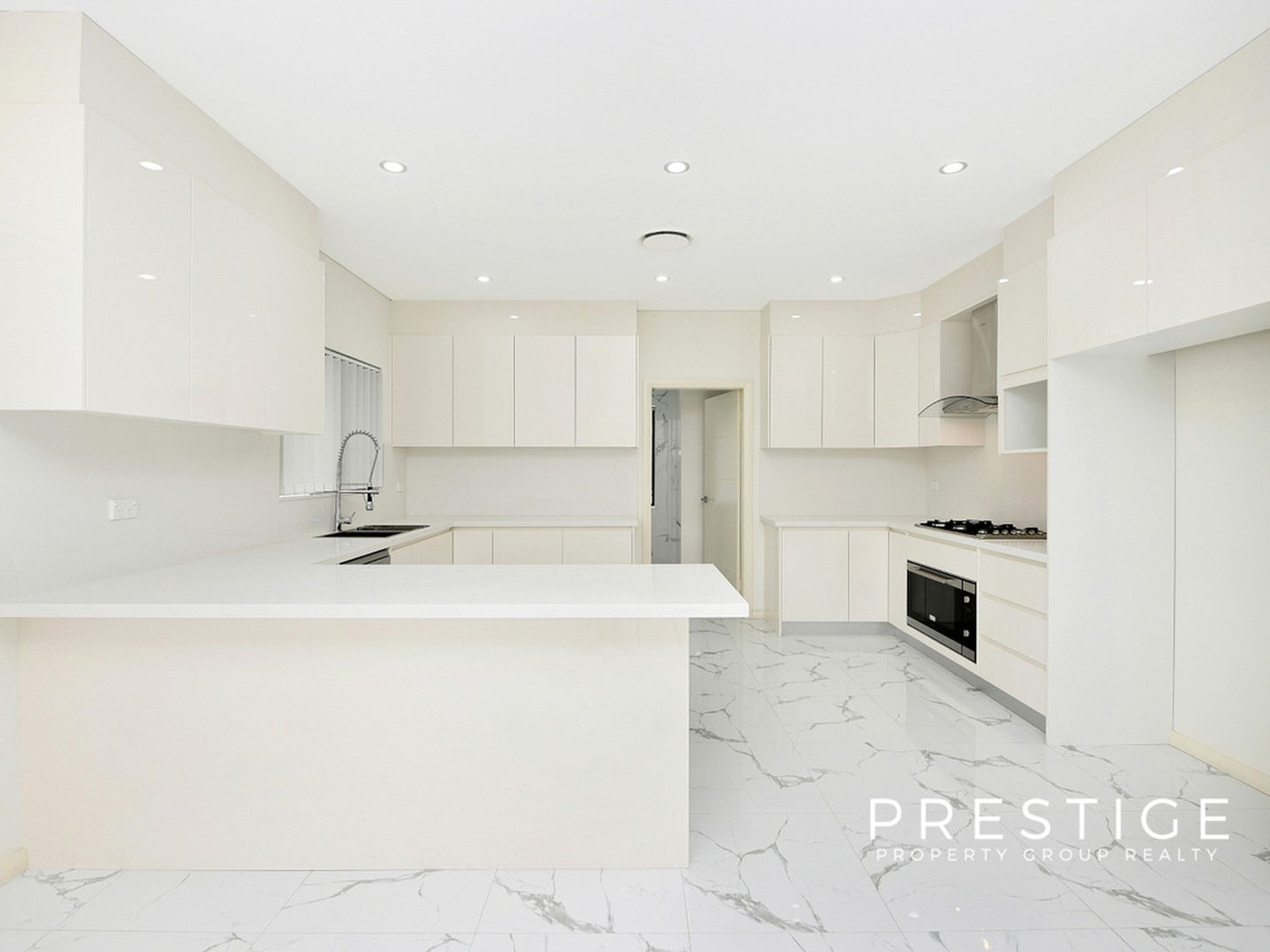 - Large gourmet kitchen with stone benchtops, stainless steel appliances and gas cooktop