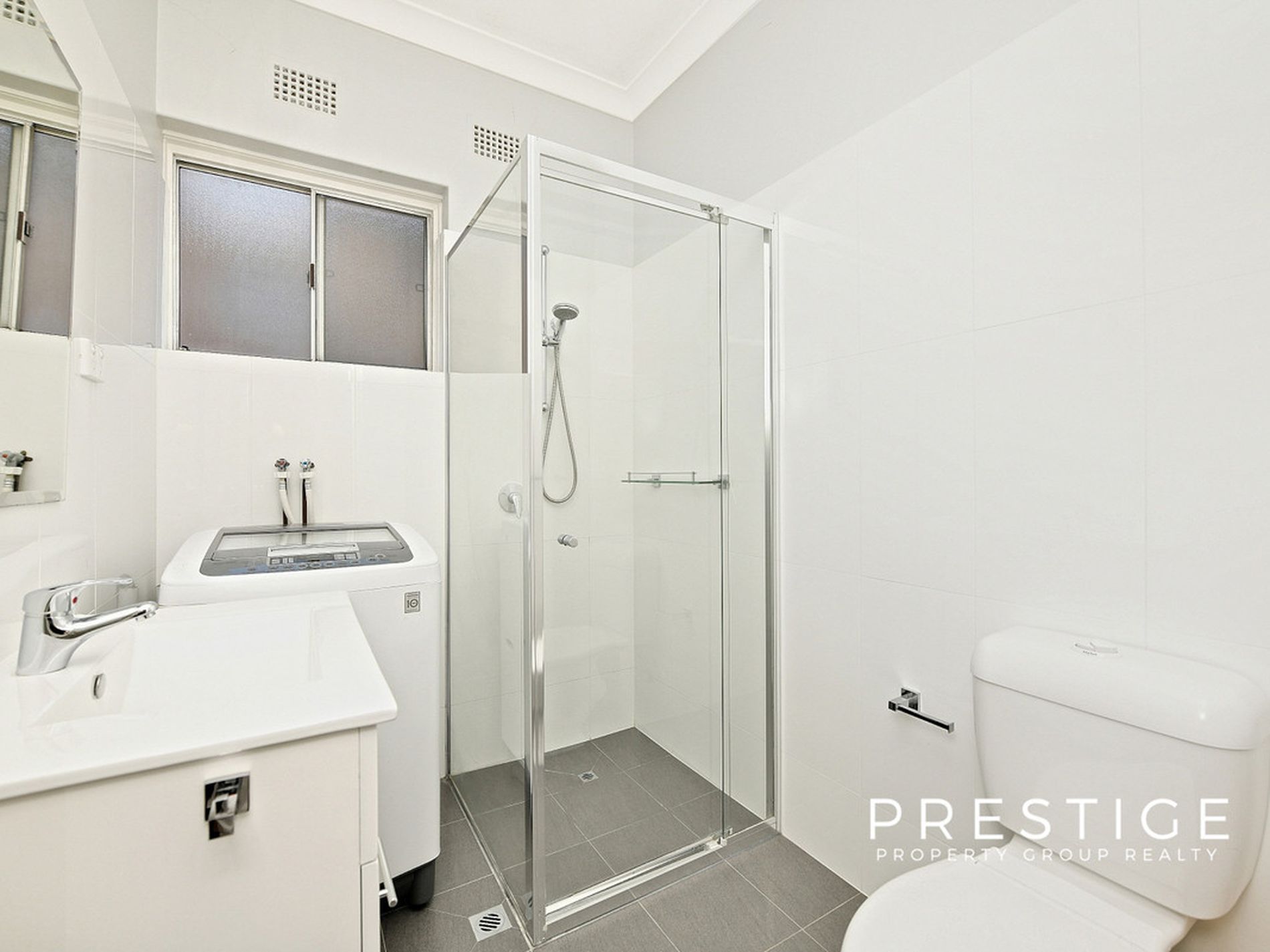 -Refurbished bathroom with washing machine.