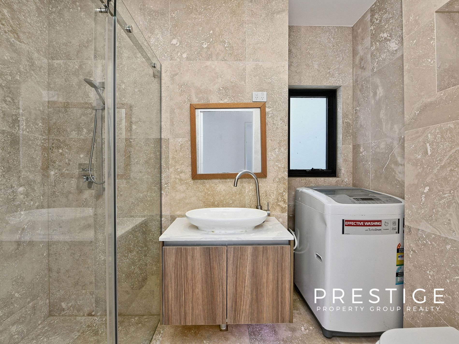Stylish bathroom with floor to ceiling tiles and oversized shower